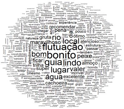 Na nuvem há predominância de vocábulos que remetem às atividades aquáticas locais, por exemplo, ‘flutuação’, ‘água’, ´cachoeira’ e ‘peixe’. Esses termos dão robustez à importância do elemento água como indutor do turismo no município de Bonito e como fonte da principal diversão desses visitantes. Apenas um extrato retirado de um comentário exemplifica quantas opções orbitam em torno da água e as atividades decorrentes dela: