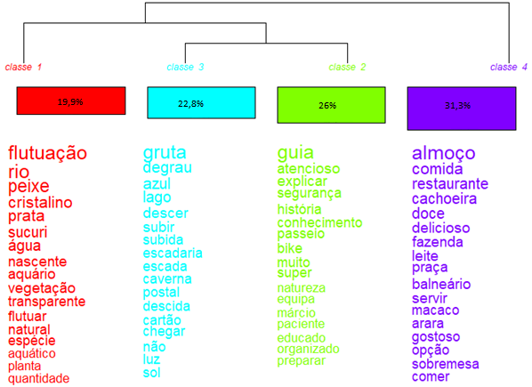 Os resultados, em síntese, corroboraram a cidade como destino de turismo de natureza e aventura, tendo a água como fonte principal de diversão dos turistas com várias atividades de lazer orbitando ao redor de sua presença (flutuação, mergulho, cachoeiras, rios e peixes). Para que algumas dessas atividades ocorram, no entanto, existem meses e épocas do ano mais propícios para visitação por conta da estiagem que favorece águas cristalinas, nesse ponto, o eWOM cumpre sua função com diversas dicas para a melhor diversão – e, consequentemente, para o planejamento mais adequado das atividades oferecidas por todo o trade turístico de Bonito.