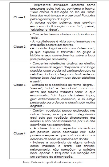 Resumen: Los turistas basan cada vez más sus percepciones y decisiones sobre un destino turístico a través de textos, mapas, imágenes y videos producidos principalmente por otros turistas y disponibles en Internet. Estas informaciones componen el boca a boca electrónico (eWOM) y son el objeto de este artículo, que tiene como objetivo analizar los principales atributos valorados por los turistas que comentaron en el sitio web de TripAdvisor sobre los atractivos turísticos visitados en la ciudad de Bonito/MS - un Destino turístico relevante en el Estado de Mato Grosso do Sul y en Brasil. Para lograr este propósito, se realizó una investigación de enfoque cualitativo, con muestreo crítico y basado en los principios de la netnografía, además del uso del software Iramuteq para el procesamiento de datos. Se encontró que los turistas valoran atributos relacionados con el medio ambiente, corroborando el énfasis de Bonito/MS en las actividades relacionadas con el turismo de naturaleza y aventura, especialmente con el elemento agua ocupando un lugar destacado para la atracción de turistas. Además, se investigó cómo la figura del 'guía', el 'precio' y las actividades de ocio que se practican en la región impactan en la valoración general de los turistas.