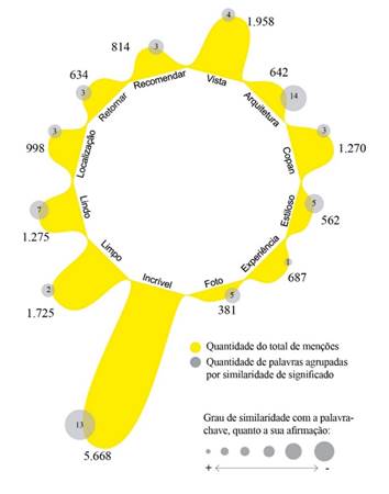 Após a coleta e a sistematização dos comentários, os dados foram inseridos no software Iramuteq que forneceu resultados acerca da frequência com que as palavras aparecem no texto. A partir disso, foi realizado o agrupamento por similaridade de significados, prosseguindo ao somatório de quantas vezes esse conjunto de termos aparece nas avaliações retiradas do Airbnb. Assim, foi possível traçar algumas considerações sobre as percepções e as possíveis motivações dos usuários quanto à hospedagem no Edifício Copan.