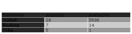 O resultado dessa pesquisa revelou uma grande disparidade entre o que é disponibilizado no Airbnb e em outras plataformas. Enquanto no Airbnb foi possível encontrar 28 anúncios de apartamentos, o Booking continha sete e o Vrbo apenas cinco. A diferença refletiu também na quantidade de avaliações encontradas. Os anúncios do Airbnb totalizaram 3.598 comentários, os do Booking 14 e no Vrbo foi possível encontrar somente um comentário (quadro 1). Em função da quantidade expressiva de avaliações encontradas nos anúncios do Airbnb, quando comparada com as outras plataformas, optou-se por concentrar as análises da pesquisa nos comentários desse site.