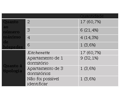 Em relação aos atributos físicos dos apartamentos, percebe-se que a maioria, cerca de 60%, possui capacidade para acomodar até dois hóspedes. Esse dado dialoga com outro aspecto relativo à tipologia dos imóveis. Utilizando as fotos que constam nos anúncios do Aibnb e os tipos de apartamentos do Copan apresentados por Galvão (2007), foi possível observar que mais de 90% deles correspondem a kitchenettes ou apartamentos de um dormitório (quadro 2). Por conta disso, é comum que a maioria só possua uma cama de casal ou, no máximo, mais uma cama de solteiro ou sofá-cama, restringindo a capacidade para duas, três ou, em poucos casos, quatro pessoas.