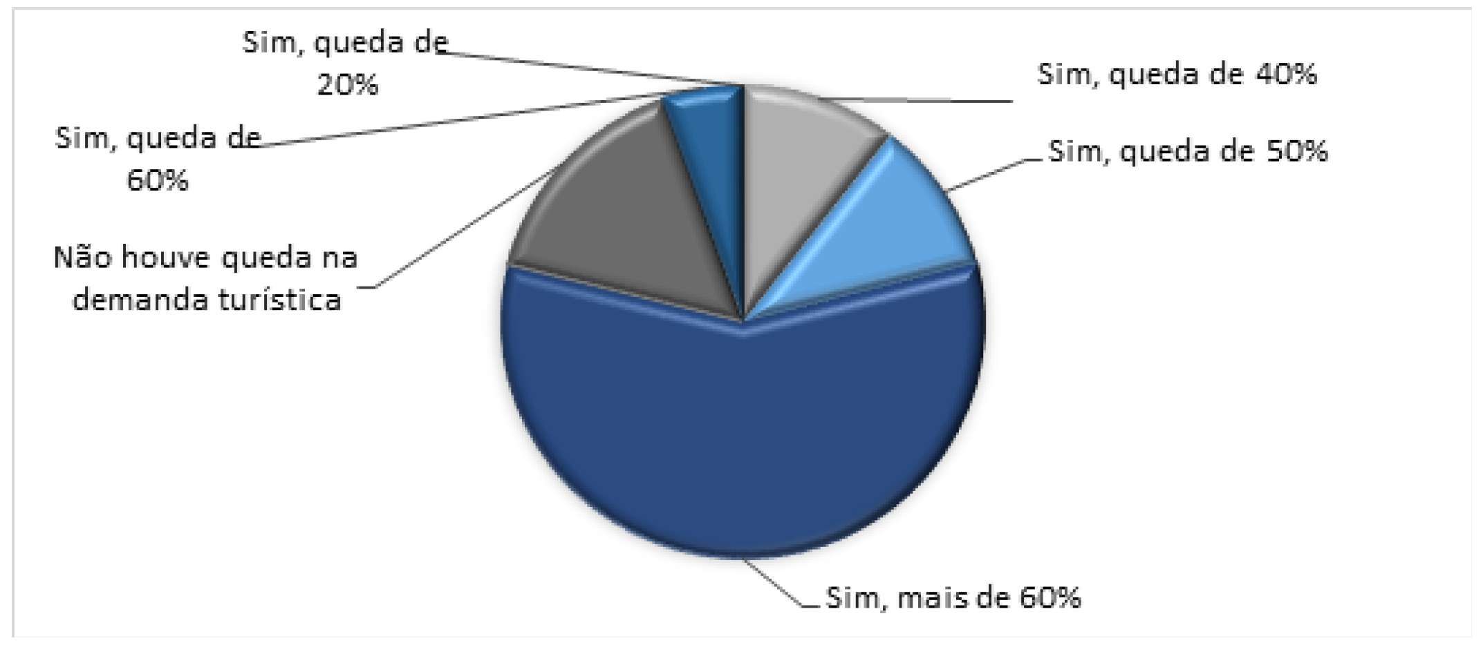 Após o período que permaneceram paralisados, 11 (58%) dos 19 entrevistados relataram queda de mais de 60% na demanda durante a retomada das atividades. Além disso, apenas três (16%) dos entrevistados salientaram não perceber nenhum tipo de queda em sua demanda real (Gráfico 2). De acordo com Jayasinghe, Selvanathan e Selvanathan (2020), a demanda turística sofre interferência ao passo que um evento inesperado acontece. Os autores referem-se ao evento climático que ocasionou o tsunami de 2004, na Ásia, diminuindo consideravelmente o número de turistas internacionais nos meses subsequentes.