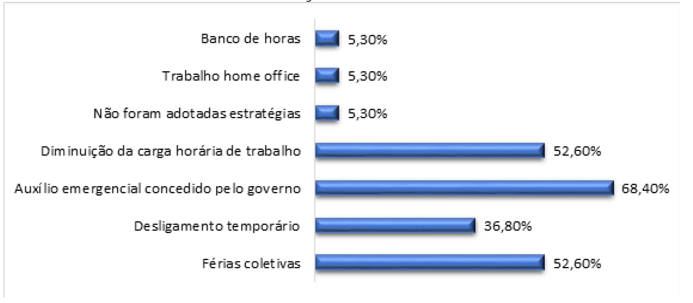 A terceira questão identificou se alguma empresa hoteleira decidiu desligar colaboradores com o propósito de conter gastos. Dos respondentes, 78,9% não dispensaram nenhum colaborador, enquanto 15,8% demitiram colaboradores do setor de alimentos e bebidas, 10,5% do setor de serviços e 5,3% do setor de lazer e recreação. Tal decisão é corroborada por Hao, Xiao e Chon (2020) que argumentam como essencial o alto desempenho dos funcionários para a instituição durante desastres. A respeito das estratégias de retenção de colaboradores, todos os MHs adotaram algum mecanismo sobre esse aspecto. O auxílio emergencial (68,4%), por meio de medidas governamentais foi uma das alternativas para suavizar os efeitos da crise econômica para que os dirigentes pudessem utilizá-lo como meio para reter seus colaboradores momentaneamente (durante o período crítico da crise e lockdown). Na sequência, adotaram as férias coletivas e a diminuição da carga horária de trabalho, ambos com 52,6% (Gráfico 3). Isso corrobora o posicionamento de Enz e Taylor (2002) e Belau (2003), quando uma crise persiste, pois as empresas tendem a reduzir o custo de mão de obra antes de demitir funcionários.