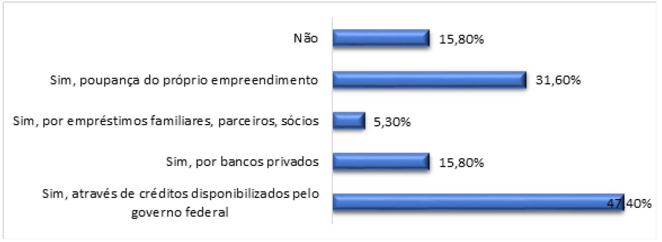 Com relação à adesão de suporte financeiro durante a pandemia, verificou-se que nove dos 19 entrevistados (47,4%) solicitaram os créditos do governo federal e, em segundo lugar, usufruíram da poupança do próprio empreendimento (Gráfico 4).