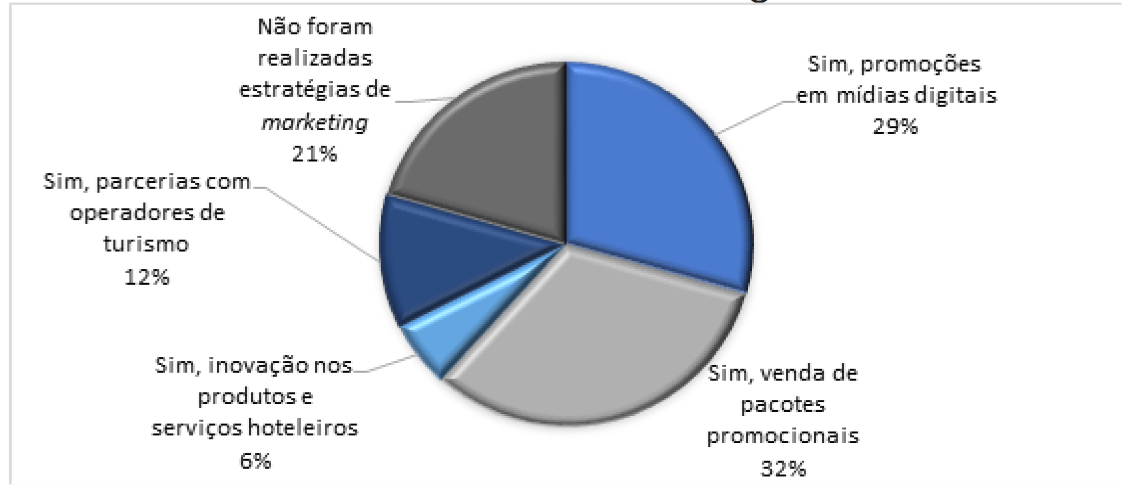 Em analogia à crise de 2008, Monti (2011) enfatiza a necessidade de medidas governamentais econômicas para empresas turísticas em respostas aos efeitos negativos no estado do Rio Grande do Norte, como mudanças no regime tributário de pequenas e médias empresas do setor. O último item avaliou a gestão de marketing, que tem por finalidade conquistar novos clientes e fidelizar os habituais. No Gráfico 5, pode-se constatar que o ponto de maior concordância entre os entrevistados foi a venda de pacotes promocionais (32%) e o menos citado foram as inovações nos produtos e serviços hoteleiros (6%).