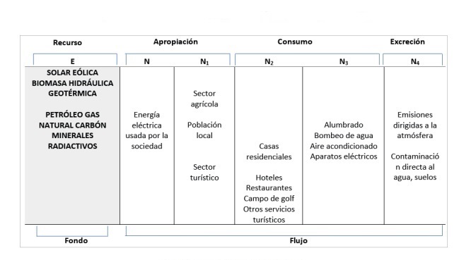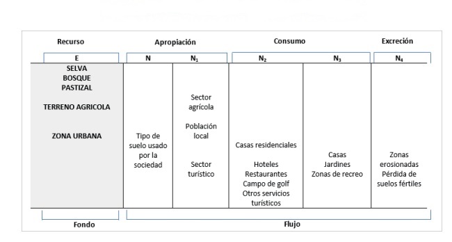 Para la evaluación, se determinó un conjunto de atributos que definen los consumos de cada recurso en diferentes niveles de valoración. Para evitar ambigüedades se realizó una categorización formal haciendo uso del sistema internacional de unidades de medida (hectáreas (ha.) de tierra, metros cúbicos (m3) de agua, cantidad de energía en mega watts por hora (mwh); además, se realizó la categorización semántica que se refiere a la designación que se hace de los fenómenos a partir del lenguaje que les rodea (consumo, contaminación, grado de deterioro). Igualmente, como parte de los criterios del MuSIASEM, se utilizó la gramática de flujo y fondo de Georgescu-Roegen (Cadillo, 2015) para representar los procesos socioeconómicos de producción y consumo de bienes y servicios ecosistémicos en términos biofísicos.