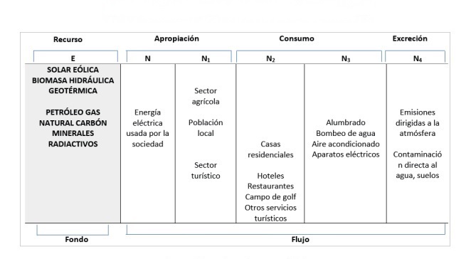 Para el análisis biofísico de la actividad turística residencial como proceso metabólico, se consideraron tres recursos naturales: tierra, agua y energía eléctrica; ya que, se considera que en ellos el impacto de la actividad residencial es más significativa y visible; además, de que su medición resulta más factible por encima de otros recursos. Para tal efecto se utilizó el método MuSIASEM (Multi-Scale Integrated Analysis of Societal and Ecosystem Metabolism por sus siglas en inglés), el cual es concebido como una gramática capaz de realizar inferencias a partir de las características o propiedades de los fenómenos, con la finalidad de obtener una representación de estos (Giampietro et al., 2009; Giampietro et al., 2013).