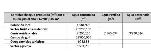 En la parte de excreción se analizaron dos procesos que corresponden al agua perdida (por evaporación y distribución) y al agua desechada, de lo cual se destaca que del total invertido de este recurso para el sector turístico residencial sólo el 44% es realmente aprovechado. Por otra parte, la contaminación que por falta de drenaje público genera el agua que se desecha es una gran problemática por atender, pues, aunque el municipio cuenta con dos plantas tratadoras, los encargados de las casas residenciales comentan que el agua tal y como sale con desechos sólidos se vierte en los ríos (principalmente en el río San Miguel).