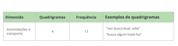 Para facilitar a análise, os resultados serão apresentados em quadros que conterão o total de quadrigramas identificados e aferidas quantas vezes uma mesma sequência de palavras se repete no corpus, formando a amostragem de apresentação, conforme indicado por Serra, Font, Ivanova (2016) e Flick (2008). Os comentários dos visitantes serão catalogados relacionando os quadrigramas com os fatores motivacionais push e pull, já apresentados e consolidados na literatura.