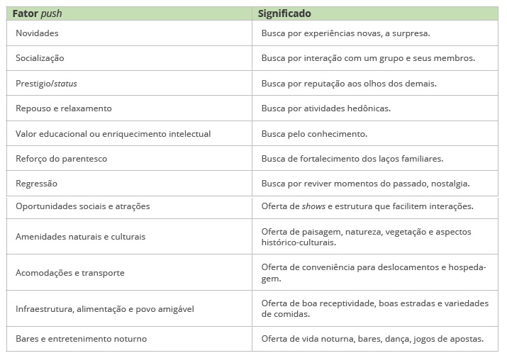 Assim, se observam no Quadro 1 os fatores push e pull mais comuns na literatura, a partir de Fakeye e Crompton (1991), Crompton e McKay (1997).