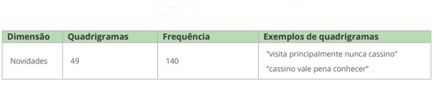 No que tange aos fatores que empurram o turista para visitar os cassinos, a primeira variável que se destaca com 49 quadrigramas denomina-se “novidades” que se repetiram 140 vezes (Quadro 4). Pode-se inferir que grande parte dos turistas que comentam sua visita aos cassinos o consideram algo diferente evidenciando que este atrativo personifica a novidade.