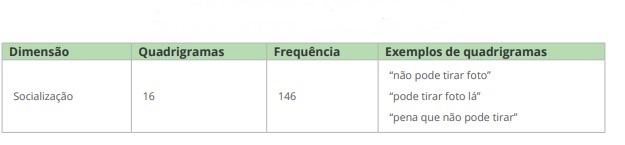 Em segundo lugar emergiu a dimensão “socialização”, a qual foram associados 16 quadrigramas, que apareceram 146 vezes ao longo do corpus analisado (Quadro 5). Alguns exemplos foram selecionados, indicando a socialização relacionada à fotografia “não pode tirar foto”, “não é possível tirar foto”. Nesse aspecto, o conjunto de comentários revela que há o interesse dos turistas na socialização, evidenciando o que foi indicado por Alves et al. (2017), que o turista almeja, durante o tempo livre, aproveitar tudo que lhe é ofertado e fotografar tudo. Com suporte neste entendimento é que se considerou o relato da proibição de fotos como evidência da importância desse fator motivacional.
