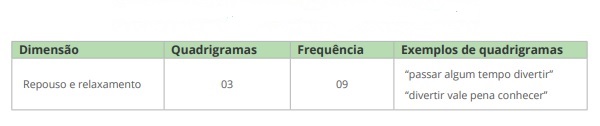 Já o terceiro fator motivacional identificado refere-se ao item “repouso e relaxamento”, que agregou três quadrigramas, e foi entendido como manifestação de interesse em atividades hedônicas. Esse conjunto sequencial de palavras ocorreu nove vezes ao longo dos textos analisados (Quadro 6). Essa dimensão revela que os turistas indicam em seus comentários que são impulsionados pelo desejo de diversão, fato também retratado por Carvalho (2021) ao estudar os fatores push de cassinos da costa europeia. O fator “repouso e relaxamento” aparece nos achados em menor número de menções, situação similar aos estudos de Moyano et al. (2012) e Albergaria (2016).