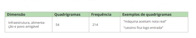 No que diz respeito ao primeiro fator pull identificado tem-se “infraestrutura, alimentação e povo amigável”, referente, neste caso, à completude de uma experiência que representa bem a receptividade dos países de fronteira, em relação aos turistas de cassino. Neste item, somam-se 54 quadrigramas, os quais apareceram 214 vezes ao longo do texto, conforme apresentado no Quadro 7.