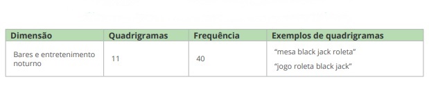 Em seguida, tem-se “bares e entretenimento noturno”, neste caso, trata-se da oferta dos cassinos como atrativo complementar a partir de Foz do Iguaçu e caracteriza-se como uma opção de entretenimento noturno. Neste item somam-se 11 quadrigramas, os quais apareceram 40 vezes ao longo do texto, conforme apresentado (Quadro 8).