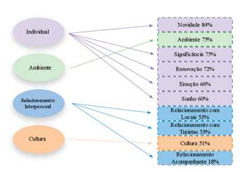Perante a literatura exposta, observa-se que tratar das ETMs exige compreendê-las como um construto multidimensional, isto é, afirmar que as experiências memoráveis resultam de um conjunto de elementos e processos que permeiam a experiência turística. Coelho (2017) examina, em uma amostra de viajantes brasileiros, os aspectos que tornam uma viagem memorável (figura 1). O tratamento estatístico dos dados revelou quatro dimensões principais que afetam a memorabilidade da experiência: o ambiente; a cultura; as relações interpessoais; e as influências individuais e psicológicas. Cada dimensão é operacionalizada por um conjunto de variáveis, das quais as mais significantes para a memorabilidade são: o grau de novidade proporcionado pela experiência turística, corroborando Kim & Ritchie (2014), o ambiente, o significado proporcionado pela viagem, a renovação, os aspectos emocionais e a sensação de realização de um sonho.