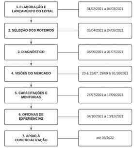 O Projeto Experiências do Brasil Rural (EBR) ocorreu de fevereiro de 2021 a janeiro de 2022, de forma remota, e contou com diversas etapas, ilustradas na figura 2.