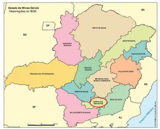 A Rota do Queijo foi um dos oito integrantes contemplados pelo primeiro Edital da Chamada Pública n. 001/2021 do Projeto EBR. Está localizada na mesorregião do Campos das Vertentes, no centro-sul do estado de Minas Gerais (Gajo et al., 2017), conforme a Figura 3, a seguir. A região fica a 1578 km da capital, Belo Horizonte e possui uma área total de 12.563,667 km.