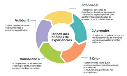 Na sequência, a sexta etapa do projeto – Oficina de experiências – proporcionou cursos para a criação de ETMs aos participantes do projeto, em busca de qualificar os roteiros por meio da inserção de produtos e de serviços da agricultura familiar no mercado turístico brasileiro, além de apoiar a formatação e o posicionamento de produtos e roteiros turísticos de experiências no meio rural. Por fim, a sétima etapa – Apoio à promoção e comercialização – providenciou suporte, juntamente ao Mtur e ao MAPA, para a divulgação dos roteiros contemplados no Edital, como a participação dos roteiros nas feiras e eventos relevantes que ocorreram de forma presencial, em 2021, como o Festival Internacional de Turismo (FESTURIS), em Gramado (RS) e o Festival das Cataratas, em Foz do Iguaçu (PR), elaboração de um catálogo com imagens e fotos dos membros do roteiro, dentre outros.