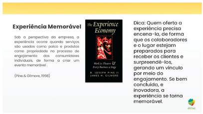 Além disso, Pine e Gilmore (1998, 2011) propõem cinco princípios para o design de experiências memoráveis. O primeiro se refere à tematização da experiência, isto é, ela deve fazer alusão a alguma temática que perdure a experiência. Em segundo lugar, a experiência deve ser permeada por sinais positivos, instruções fáceis de se seguir. Em contraste ao segundo ponto, o terceiro é eliminar referências ou distrações negativas. A quarta orientação sugere a materialização das experiências – souvenirs, lembrancinhas, fotografias ou outros elementos de cultura material que tornam a memória da experiência tangível. Por último, a quinta diretriz sugere que uma experiência estimule o máximo de sentidos possível.