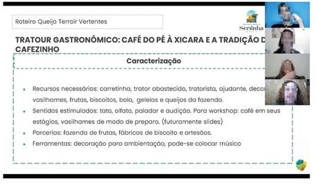 Para a execução dos dez encontros remotos referentes às oficinas, utilizou-se o aplicativo Zoom ao longo de todo o mês de outubro. A primeira e a segunda semana contaram com dois encontros de duas horas cada, referentes às fases ‘conhecer’ e ‘aprender’, respectivamente. A terceira e a quarta semanas apresentaram três encontros também com duas horas cada. Sobre a fase ‘validar’, esta ocorreu em semanas variadas para cada roteiro, tendo ocorrido na segunda semana de novembro para a Rota do Queijo.