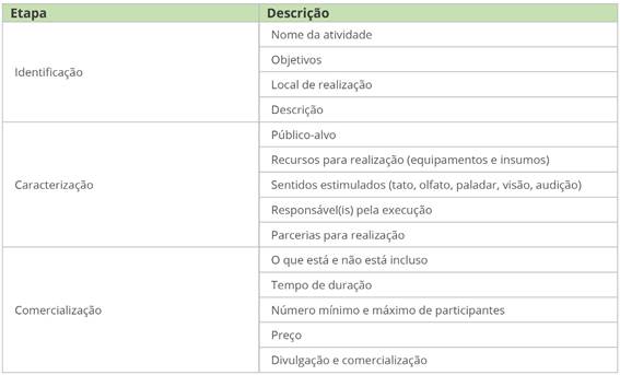 A fase ‘Criar’ contou com a orientação da equipe, em três etapas diferentes, e com a ferramenta Google Forms como apoio e registro do que os proprietários idealizavam para suas atividades. As oficinas voltadas para a criação das atividades contaram com três etapas, sendo elas: 1) Identificação, 2) Caracterização e 3) Comercialização da atividade, cada uma subdividida em tarefas, conforme o Quadro 1, a seguir, a serem executadas em três encontros: