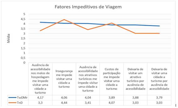 Ao se classificar a importância dos fatores impeditivos, conforme demonstrado na Figura 1, percebe-se a heterogeneidade entre o que é mais relevante para o TwDMr e o que é mais relevante para o TnD. Enquanto para o primeiro, a acessibilidade nos meios de hospedagem é o fator impeditivo de maior relevância, para o turista sem deficiência é a insegurança.