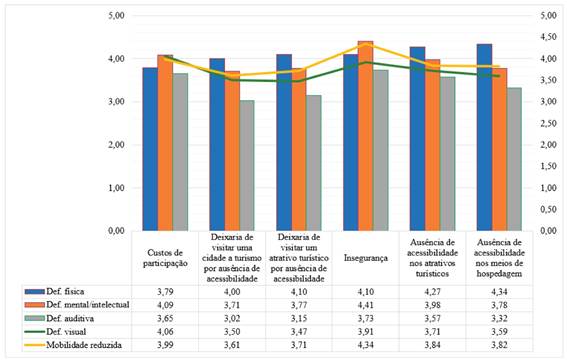 Já para o turista sem deficiência, tem-se um outro perfil de fatores impeditivos em uma viagem a turismo aparecendo como fator mais relevante: i) insegurança com significância p=0,000(média 4,44 e desvio padrão 1,00), seguido de ii) custos de participação com significância p=0,026 (média 4,07 e desvio padrão 1,02); iii) ausência de acessibilidade nos atrativos turísticos me impede de visitar uma cidade a turismo com significância p=0,000 (média 4,41 e desvio padrão 1,13); iv) ausência de acessibilidade nos meios de hospedagem me impede de visitar uma cidade a turismo com significância p=0,001(média 3,30 e desvio padrão 1,21); v) deixaria de visitar uma cidade a turismo por ausência de acessibilidade com significância p=0,000(média 3,03 e desvio padrão 1,17) e vi) deixaria de visitar um atrativo turístico por ausência de acessibilidade com significância p=0,000(média 3,03 e desvio padrão 1,18).