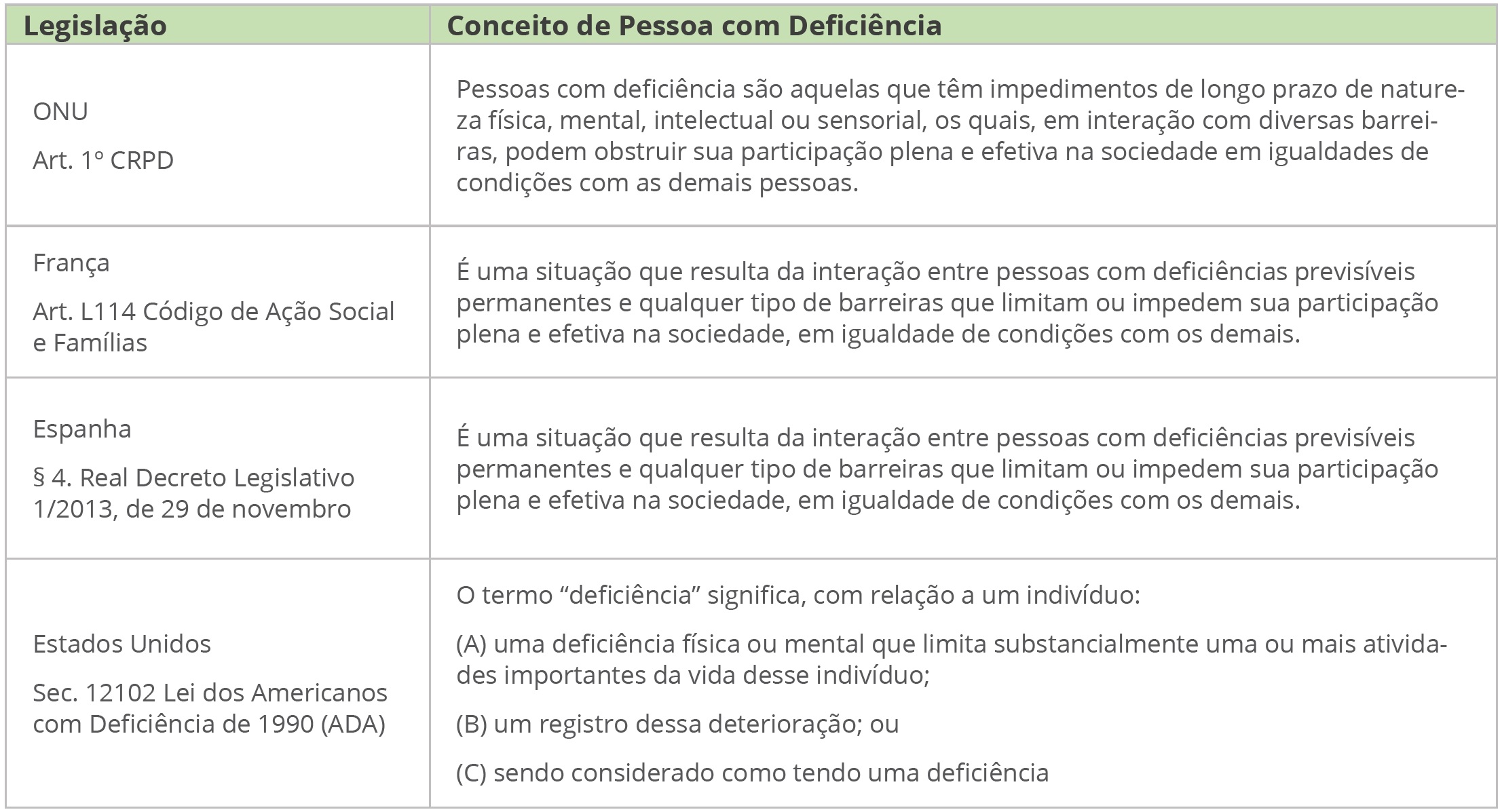 Embora cada país tenha uma legislação própria de proteção aos direitos da pessoa com deficiência, a fim de se trabalhar neste artigo com um conceito universal de deficiência, optou-se pela definição trazida pela Convenção Internacional da Organização das Nações Unidas sobre os direitos da pessoa com deficiência, que em seu artigo 1º define a pessoa com deficiência como aquela que tem impedimentos de longo prazo de natureza física, mental, intelectual ou sensorial e que, em interação com diversas barreiras, podem obstruir sua participação plena e efetiva na sociedade em igualdades de condições com as demais pessoas (ONU, 2019).
