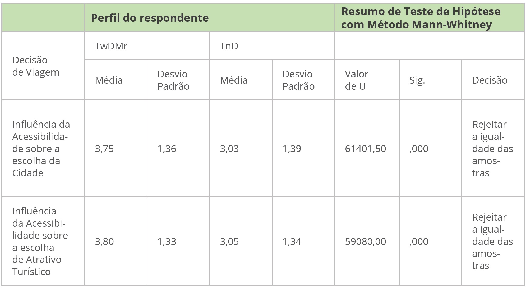 Ao se analisar a resposta dos fatores influenciadores (Tabela 2) com a aplicação do teste não paramétrico de Mann-Whitney, tem-se a verificação da hipótese nula de igualdade na percepção entre o grupo de turistas com deficiência ou mobilidade reduzida (TwDMr) versusturistas sem deficiência (TnD). Na primeira variável: “influência da acessibilidade sobre a escolha da cidade”, a hipótese nula deve ser rejeitada (p=0,000), tendo as percepções dos turistas diferentes, com o TwDMr apresentando uma média 3,75 e desvio padrão 1,40, enquanto o TnD demonstra média 3,03 e desvio padrão 1,40. Na segunda variável, a hipótese nula também foi rejeitada: “influência da acessibilidade sobre a escolha do atrativo turístico” tem-se uma significância p=0,000, sendo que o TwDMr apresenta uma média 3,80 e desvio padrão 1,33 enquanto o TnD demonstra média 3,05 e desvio padrão 1,37 (Field, 2009).