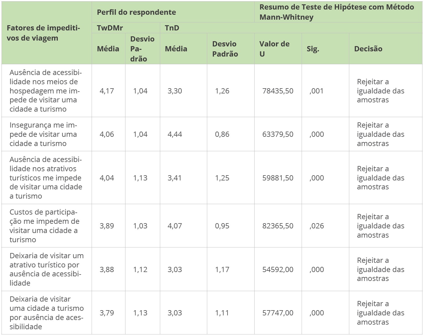 No que diz respeito aos fatores impeditivos há diferenças estatísticas nos grupos de turistas com ou sem deficiência em todas as seis variáveis apresentadas, todas verificadas com a aplicação do teste não paramétrico de Mann-Whitney, como descrito na Tabela 3.