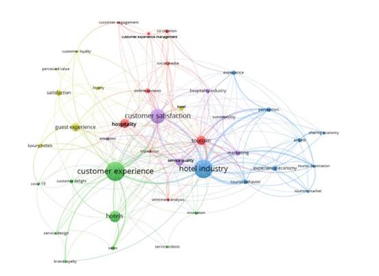 O segundo cluster, representado pela cor verde e pelo termo ‘customer experience’ têm conexões fortes com todos os clusters e apresenta termos como encantamento, lealdade à marca, inovação e robôs. Estudos como os de Tung e Au (2018) e Lu et al. (2019) explanam sobre como a tecnologia tem se tornado importante na criação de experiência, focando na introdução dos robôs de serviço com inteligência artificial na hotelaria e na aceitação deles por parte dos hóspedes. Em ambos os estudos, o antropomorfismo (dar aparência humana aos robôs) foi identificado como um fator de não aceitação do serviço. Porém, constatou-se que, ao contrário das tecnologias de autoatendimento, os robôs conseguem socializar com o cliente, o que permite que eles apoiem os serviços de hospitalidade, reforçando o toque humano essencial na experiência do hóspede. O impacto do papel funcional e interacional dos robôs na experiência merece mais estudos e os autores sugerem uma ampla agenda de pesquisa, como aceitação cultural e reflexos na cultura organizacional.
