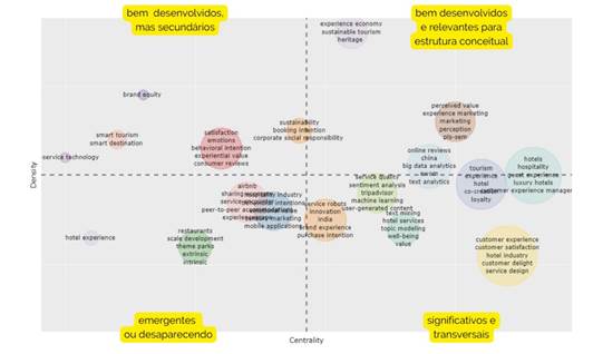 Temáticas atreladas à experiência e seus outputs, como o seu design, encantamento e qualidade, assim como as questões relativas à tecnologia no processo da experiência, como o uso de robôs (Lu et al., 2019; Tung & Au, 2018), machine learning e mineração textual, avaliações online e plataformas (Bilgihan et al., 2014; Calheiros et al., 2017; Radojevic et al., 2015; Xiang et al., 2015), são tidas como significativas e multidisciplinares. O fato de o cluster ‘customer experience’ estar nesse quadrante ressalta o amplo espectro do conceito de experiência e de todas as dinâmicas que orbitam em torno dele como, por exemplo, a de cunho mais gerencial, como a gestão de equipes, que aparece de forma significativa nos estudos analisados (Hwang & Seo, 2016; Kandampully et al., 2018). Por sua vez, gestão da experiência no turismo e hotelaria, marketing, valor percebido (Walls, 2013), cocriação (Chathoth et al., 2016), lealdade e marketing boca-a-boca (Cetin & Dincer, 2014) são significativas e bem desenvolvidas dentro da amostra. As temáticas de ambos os quadrantes são fortemente presentes nos artigos da revisão teórica e base para os mais citados.