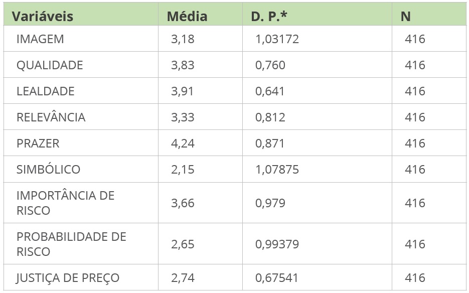 A média de respostas nos construtos foi, de modo geral, intermediária, de acordo com a Tabela 3. Somente o prazer em visitar o destino retratou valores mais altos, expressando que os participantes da pesquisa têm maior nível de concordância com as afirmativas desses construtos. Além disso, o valor simbólico, a probabilidade de risco e a percepção de justiça de preço, variável, apresentaram valores abaixo do esperado.