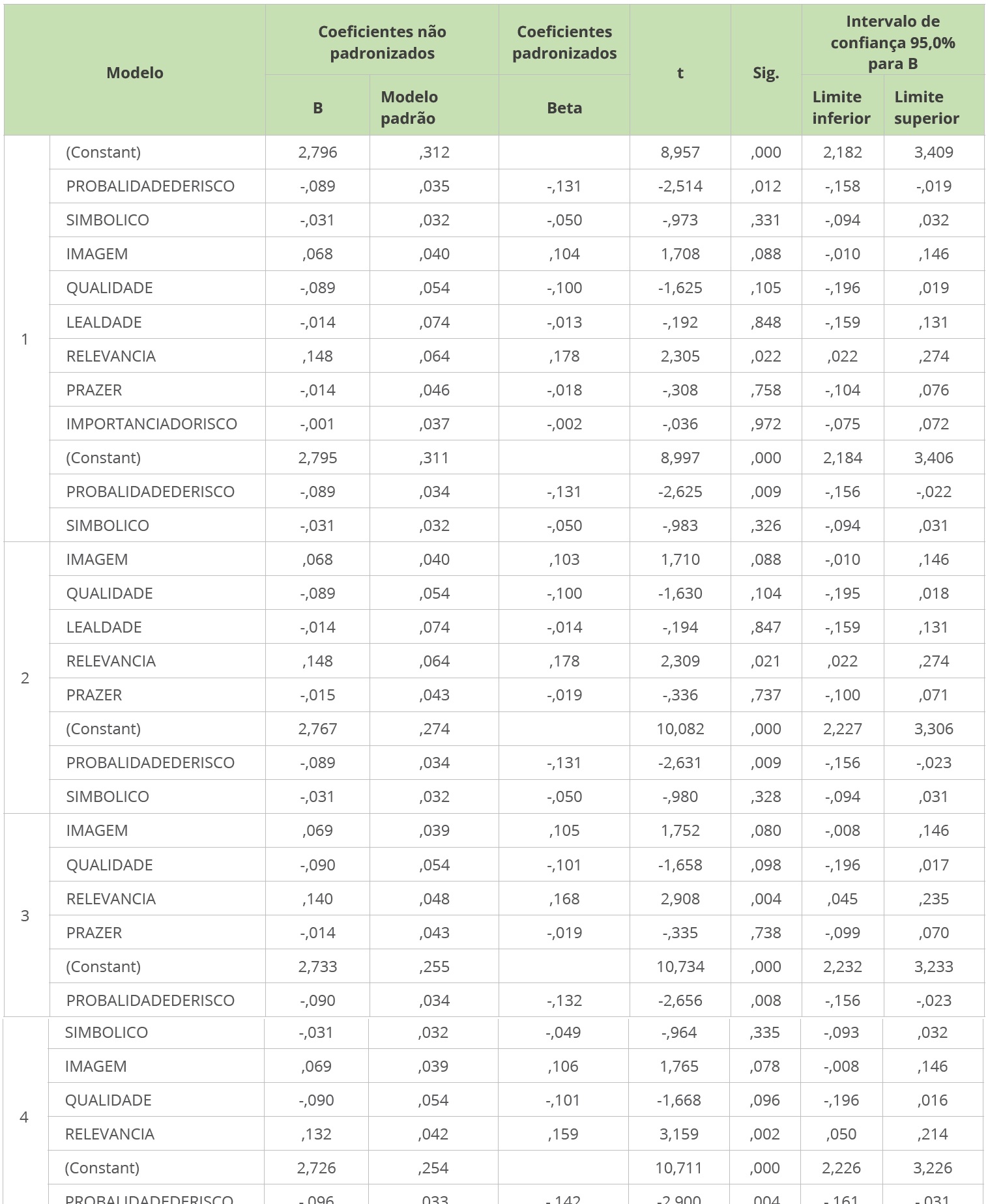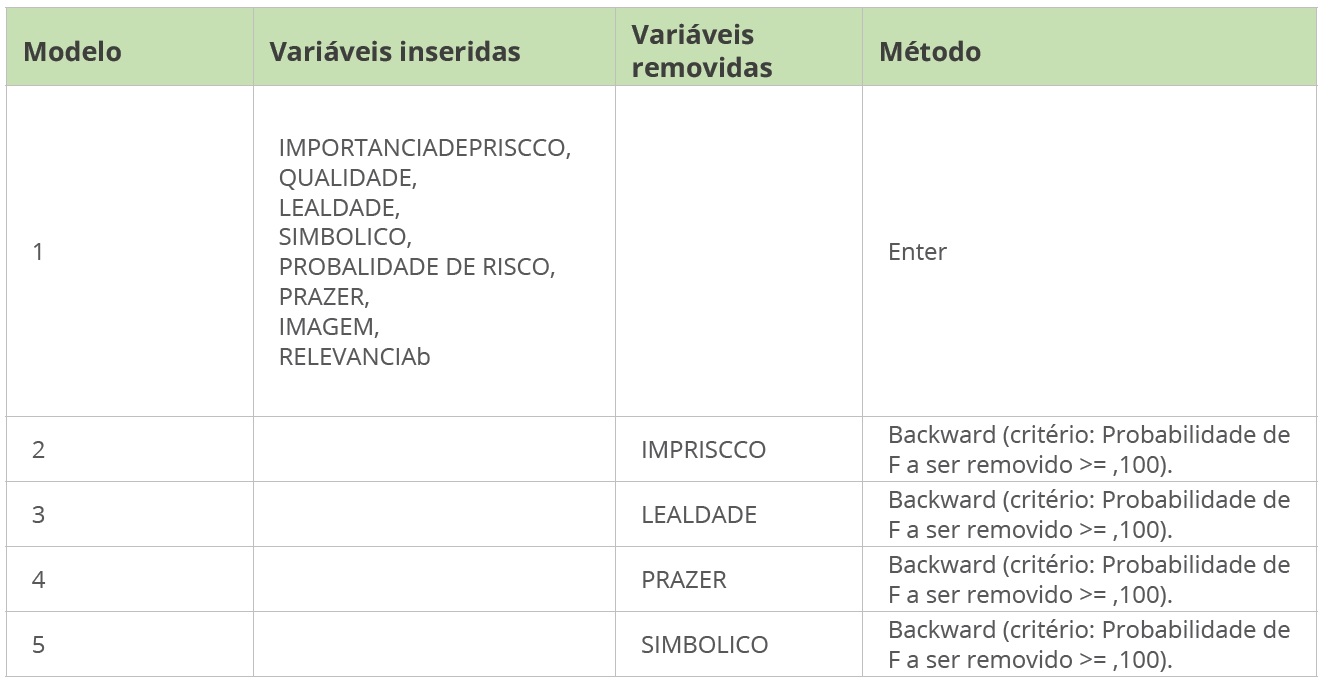 Com a realização do método backward de regressão múltipla, os resultados indicaram que não há significância estatística da importância do risco, já que foi retirado, automaticamente, a partir do modelo 2. Em vista disso, já é admissível considerar que a H2d foi rejeitada. Outros modelos foram sugeridos com a exclusão de algumas variáveis, a saber: lealdade (modelo 3), prazer (modelo 4) e valor simbólico (modelo 5). Como sintetizado na Tabela 4, apresentada abaixo.