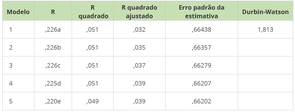 A seguir, na Tabela 5, apresentam-se os modelos aceitos na análise. Conforme descrito abaixo, o valor de R² ajustado demonstra que todos os modelos observados apresentam uma baixa intensidade de influência das dimensões das variáveis independentes em relação à percepção de justiça de preço, tendo representação de menos de 4% de explicação, em todos os modelos analisados.