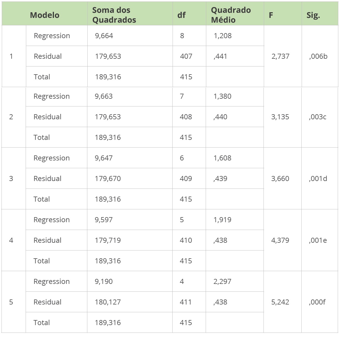 Em seguida, foi verificada a variância (ANOVA), apresentada na Tabela 6. O foco, foi averiguar o valor de Sig, que indicou significância estatística em todos os modelos, visto que o valor máximo aceitável é de 0,005 (Hair et al., 2009).