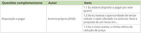 A fim de contextualizar a pesquisa, antes das afirmações, foi apresentado um cenário de um quarto de hotel, no destino escolhido pelo respondente, suas características e o referente preço proposto por uma plataforma de lances de diárias em meios de hospedagem. As questões acrescentadas, que se referiram à participação do indivíduo em leilões de diárias de hotel, foram de múltipla escolha, como demonstrado no Quadro 2. Essas questões foram elaboradas de acordo com o observado nas plataformas de leilões digitais, na qual o comprador tem a opção de aceitar o preço sugerido ou dá um lance para reduzir e analisar a nova proposta de preço do hotel.
