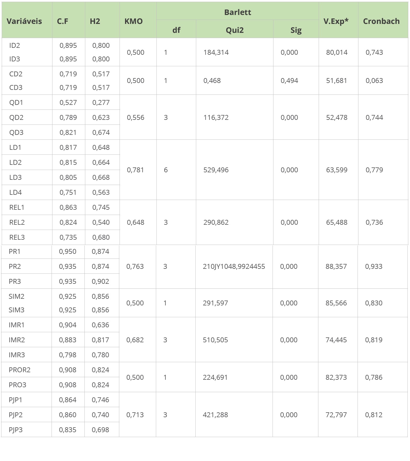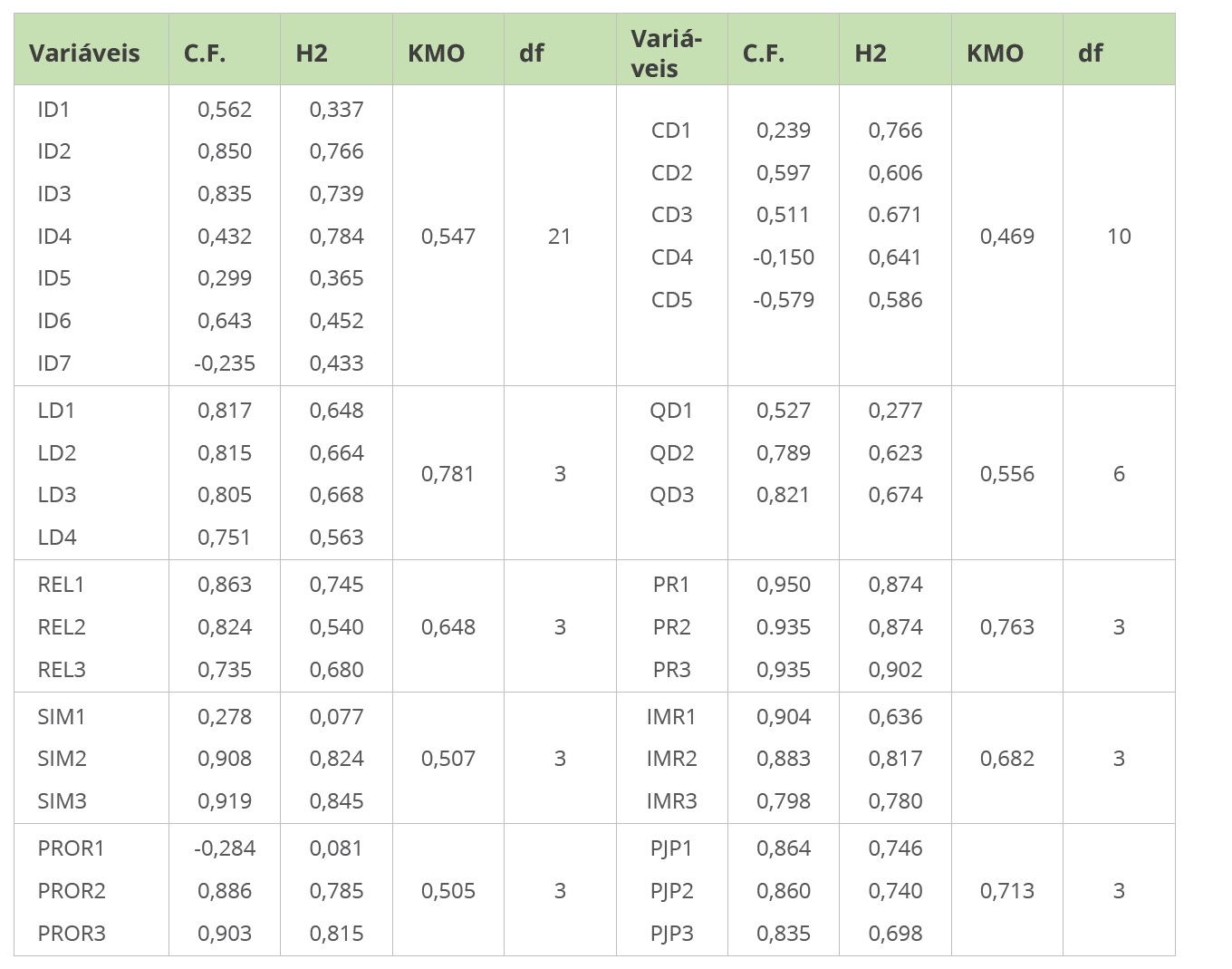 Na análise fatorial exploratória, utilizou-se o método de rotação varimax. Nesta fase, as dimensões imagem, consciência, valor simbólico e probabilidade de risco não atingiram o valor mínimo do índice desejado da carga fatorial (ID4, ID5, ID7, CD1, CD4, CD5, SIM1 e PROR1). Da mesma forma, na comunalidade (H²), verifica-se que, em quatro dimensões, os valores não alcançaram o índice mínimo esperado de 0,5 (ID1, ID5, ID6, ID7, QD1, SIM1 e PROR1, como se pode observar na Tabela 1.