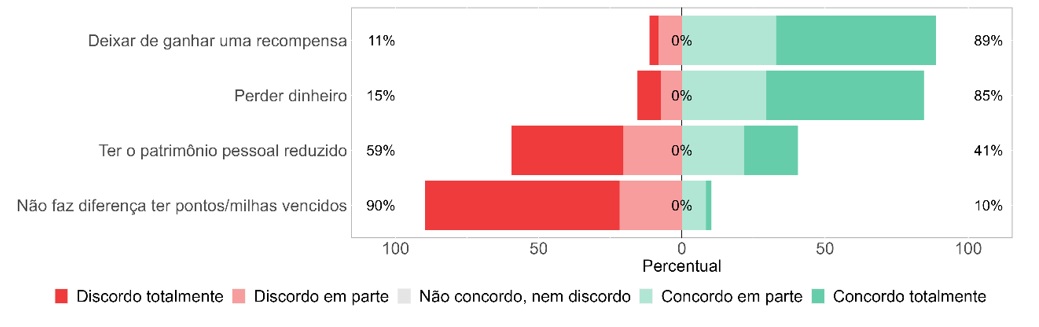 As médias das respostas indicam que apesar de haver um grau semelhante de concordância entre “deixar de ganhar” e “perder”, há um alto grau de discordância de que a expiração de pontos equivale uma redução no patrimônio pessoal. Contudo, o grau de discordância mais acentuado foi observado em relação à hipótese de neutralidade da expiração de milhas, conforme apresentado na Figura 4.