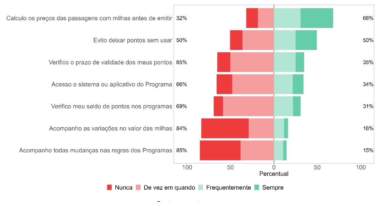 A administração das milhas exige uma série de cuidados e atividades específicas por parte dos participantes dos PM. A avaliação dos preços das passagens em moeda corrente e em milhas antes de emitir um bilhete é a atividade de gestão de milhas mais comumente realizada pelos clientes. A tomada de providências para evitar que as milhas fiquem sem utilização também é uma atividade frequentemente realizada. As demais atividades são realizadas pela maioria dos clientes apenas de vez em quando, ou até nunca. A verificação do prazo de validade e do saldo de milhas nos PM são atividades realizadas com frequência por cerca de um terço dos clientes. Já o acompanhamento de alterações no valor das milhas e nas regras dos PM são realizadas com frequência por minorias de cerca de 15% dos clientes, conforme resultados apresentados na Figura 5.