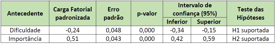 Em razão de seu conteúdo, o modelo de equações estruturais apresenta os mesmos índices de ajuste do modelo de análise fatorial confirmatória. Portanto, o modelo estrutural apresenta bom nível de ajuste aos dados. As cargas fatoriais padronizadas e seus respectivos erros padrão, p-valores e intervalos de confiança são apresentados na Tabela 7. Nota-se que a dificuldade encontrada na administração das milhas tem um efeito negativo sobre o engajamento, suportando H1. Pessoas que acreditam que administrar suas milhas é algo difícil tendem a abandoná-las, perdendo oportunidades de uso desse ativo e afastando-se das companhias aéreas que pretendiam utilizar as milhas como forma de fidelização. Por outro lado, a importância atribuída pelos consumidores aos PM exerce um efeito positivo sobre o engajamento, suportando H2. Quanto maior a importância percebida, maior é a frequência de comportamentos associados à administração de milhas. Desta forma, o modelo proposto foi suportado pelos resultados da pesquisa.