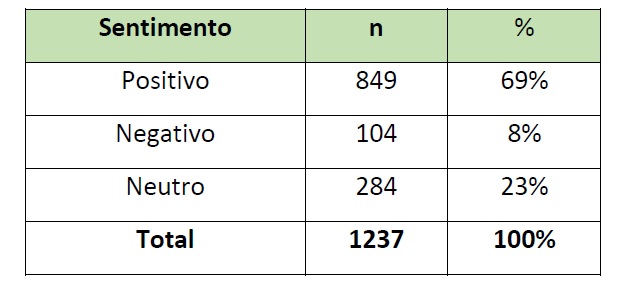 A análise desse corpus foi realizada em três etapas. Em primeiro lugar, o corpus foi sintetizado por meio da identificação e eliminação de palavras e expressões redundantes. Erros ortográficos também foram corrigidos nessa etapa. Na segunda etapa, foi realizada uma análise de sentimento manual em que as palavras e expressões foram codificadas como positivas, negativas ou neutras. Alguns exemplos de palavras classificadas como neutras são verbos, nomes de companhias aéreas e palavras comuns ao tema, como “fidelidade” e “passagem”. A maior parte das palavras/expressões que os respondentes relataram associar às milhas aéreas foi de conotação positiva, conforme resultados apresentados na Tabela 1.