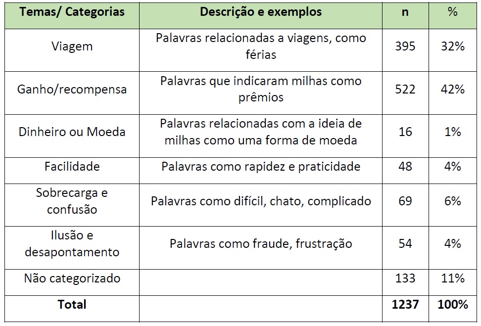 Para identificar os principais elementos relacionados ao significado atribuído às milhas, foi utilizada a técnica de associação livre (O’Leary & Deegan, 2005). Para tanto, foi apresentada a seguinte pergunta aos participantes: “Pensando em milhas aéreas, quais são as três primeiras palavras ou ideias que surgem na sua mente?”. Os participantes poderiam responder com palavras ou expressões. Por meio dessa questão, foram registradas 1237 palavras e expressões.