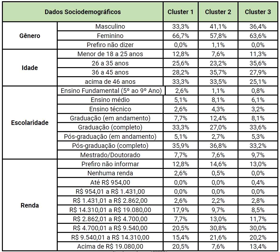 A tabela 4 – sobre os dados sociodemográficos – destaca informações cruciais sobre a distribuição de características em três clusters distintos. Primeiramente, notamos que todos os clusters são notavelmente compostos por uma maioria de mulheres, confirmando o perfil da amostra total. Porém, nos Clusters 1 e 3 o percentual de mulheres superou os 61,6%. Da amostra total, no Cluster 2, obtivemos uma participação feminina menor. Em termos de idade, o Cluster 3 se destaca com35,6% de seus membros na faixa de 26 a 35 anos, seguido pelo Cluster 1 com uma maior proporção de indivíduos acima de 46 anos, enquanto no Cluster 2 ocorre a concentração de maior destaque entre os 36 e 45 anos.