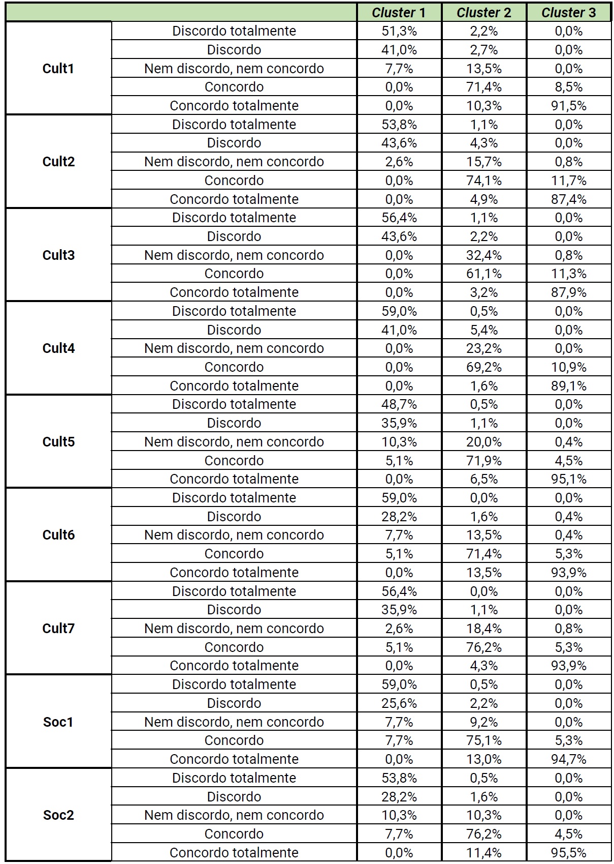 No que diz respeito à escolaridade, todos os três clusters se destacam com formação superior ou mais, sendo os Clusters1 e 3 de maneira mais intensa do que o Cluster 2. Quanto à renda, o Cluster 2 tem a maior proporção de pessoas com rendana faixa de R$ 9.540,01 a R$ 14.310,00, seguido pelo Cluster 3, enquanto o Cluster 1 inclui uma parcela significativa de indivíduoscom renda acima de R$ 19.080,00. Esses resultados fornecem achados sobre as características demográficas decada cluster, que apresentam semelhanças e, portanto, não são essas características que as definem enquanto grupos.Esses clusters não apresentaram elementos marcantes que justifiquem ações específicas de marketing, com relação àscaracterísticas sociodemográficas. A seguir, apresenta-se a tabela 5 que compõe a distribuição das percepções culturaise sociais por cada cluster.