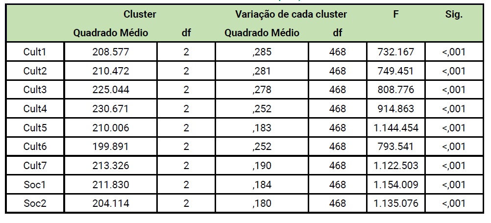 A Tabela 1 exibe os resultados de um teste de Análise de Variância (ANOVA), que tem como objetivo comparar os níveis de concordância relacionados às variáveis de percepção nas dimensões Cultural (de Cult1 a Cult7) e Social (Soc1 e Soc2) entre diferentes grupos, também conhecidos como clusters. Cada linha da tabela representa uma dimensão específica.