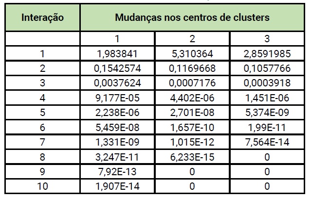 A iteração foi encerrada na décima etapa por dois motivos principais. Primeiro, a mensagem “As iterações pararam porque o número máximo de iterações foi alcançado” sinaliza que o algoritmo atingiu o limite predefinido de iterações. Segundo, o valor “A máxima mudança absoluta de coordenadas para qualquer centro é 9,326” sugere que a variação nos centroide sdos clusters tornou-se insuficientemente pequena, aproximando-se de zero, um critério frequentemente adotado para estabelecer a convergência do algoritmo.