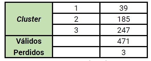 A tabela 3 apresenta o número de casos em cada cluster após a aplicação do algoritmo de clustering. Cada cluster é identificado pelo número (Cluster 1, Cluster 2, Cluster 3) sendo que os valores apresentados representam a contagem de casos atribuídos a cada cluster. No total, há 471 casos válidos. Três casos foram perdidos ou não foram atribuídos a nenhum dos clusters. O Cluster 1 tem 39 casos, o Cluster 2 tem 185 casos e o Cluster 3, o maior, com 247 casos. Esses númerosmostram como os casos se distribuíram nos clusters após a análise de clustering.